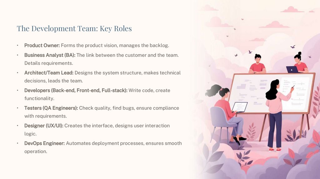 The Development Team: Key RolesProduct Owner: Forms the product vision, manages the backlog.