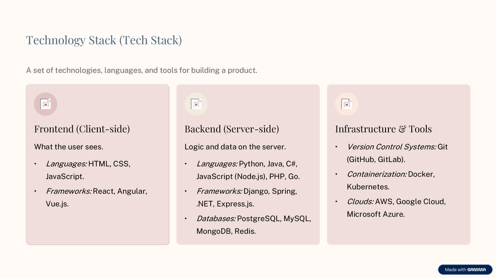Technology Stack (Tech Stack)A set of technologies, languages, and tools for building a product.