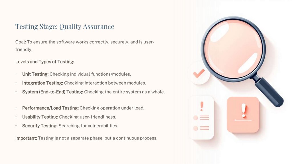 Testing Stage: Quality AssuranceGoal: To ensure the software works correctly, securely, and is userfriendly.