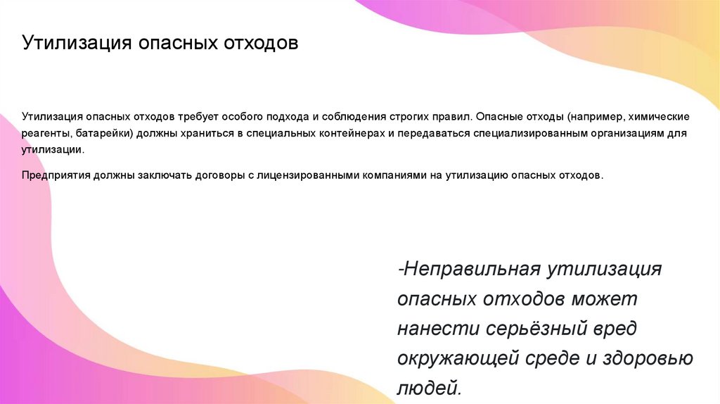 Утилизация опасных отходовУтилизация опасных отходов требует особого подхода и соблюдения строгих правил. Опасные отходы (например, химические