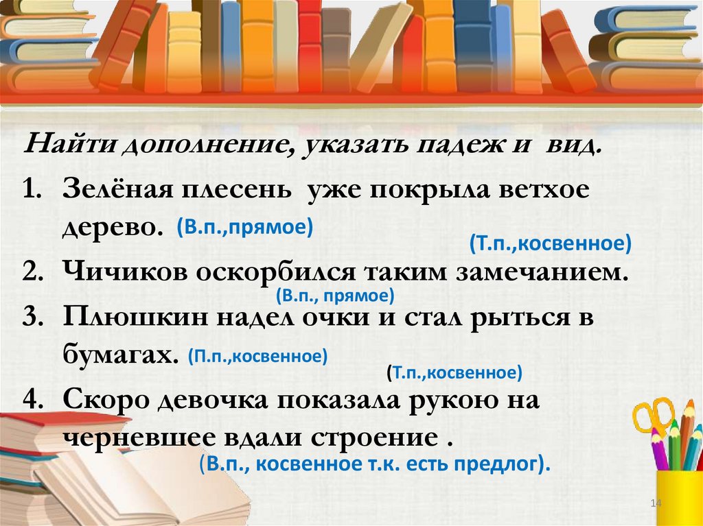 Найти дополнение, указать падеж и вид.1. Зелёная плесень уже покрыла ветхое