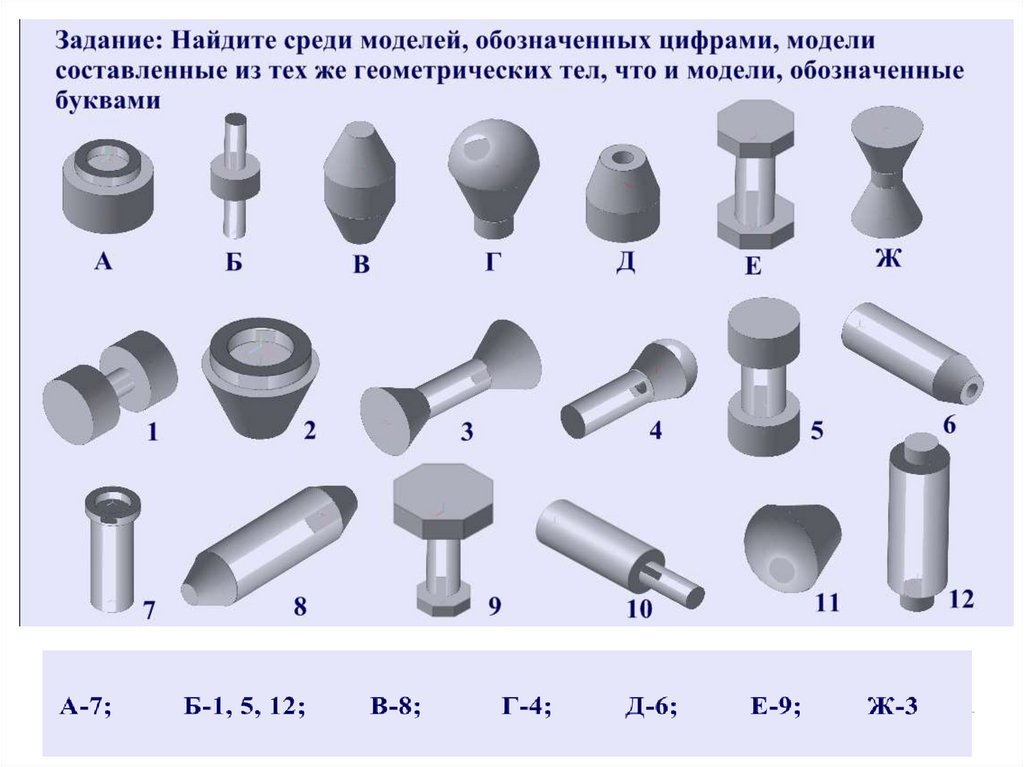 • Выбрать задание, где изображена группа геометрических тел (призма,