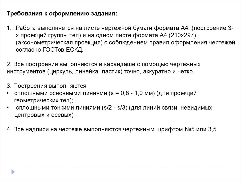 Требования к оформлению задания:1. Работа выполняется на листе чертежной бумаги формата А4 (построение 3х проекций группы тел) и на одном листе формата А4 (210x297)