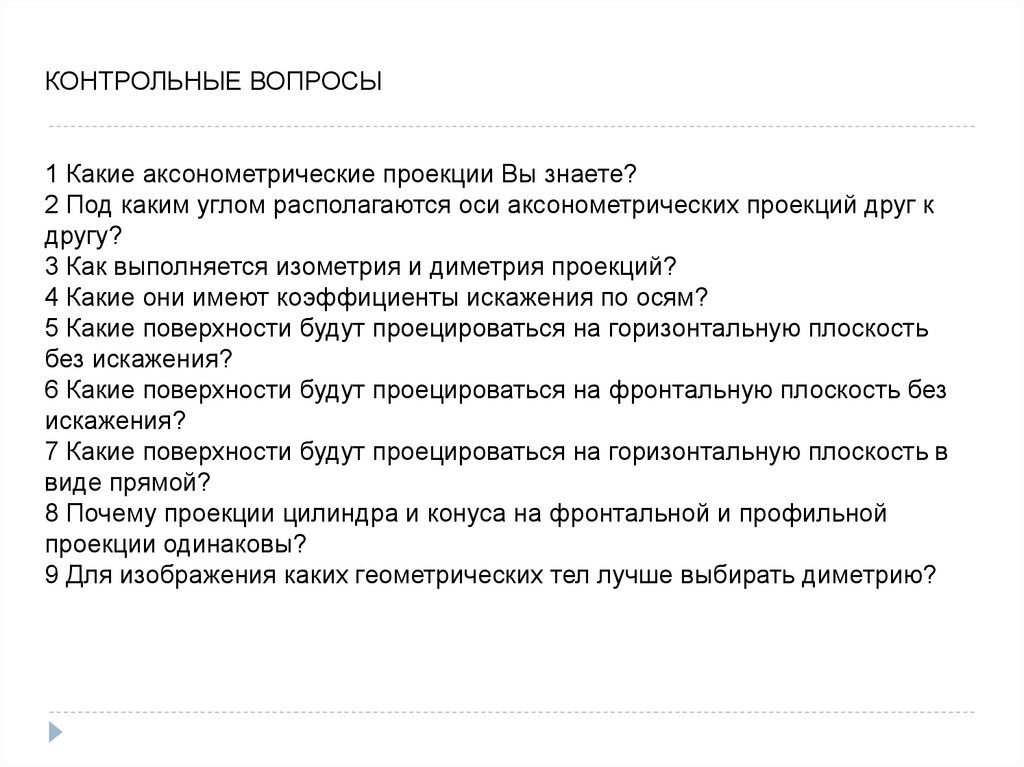 КОНТРОЛЬНЫЕ ВОПРОСЫ1 Какие аксонометрические проекции Вы знаете?