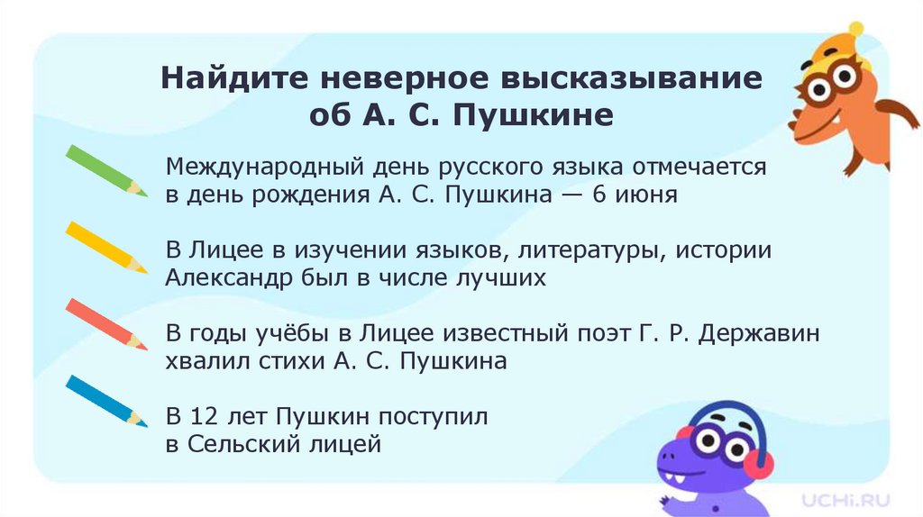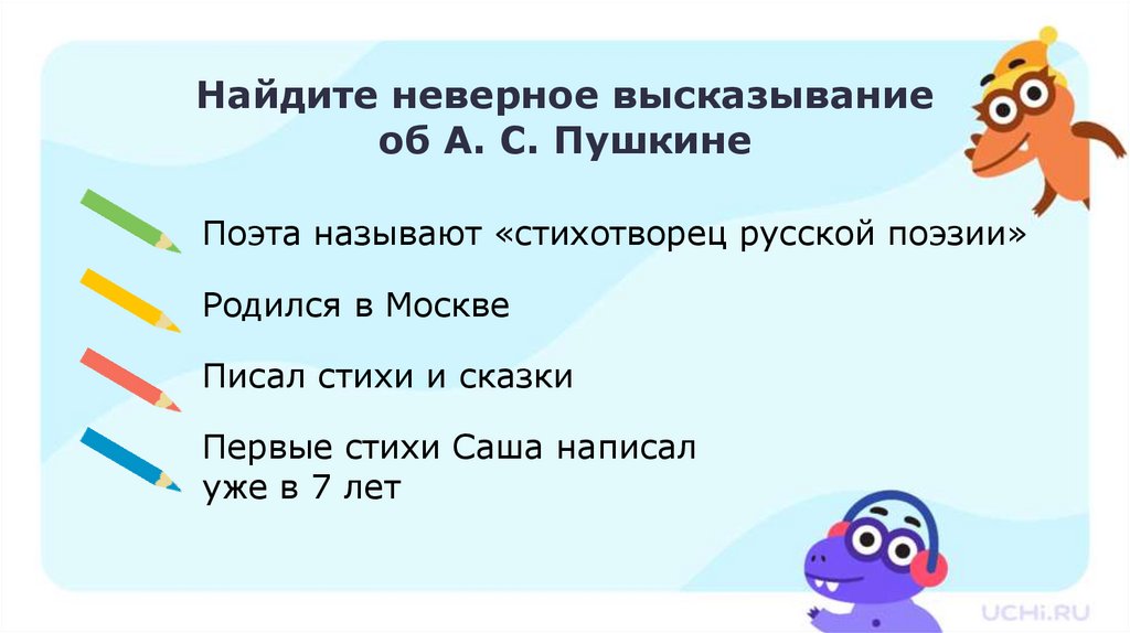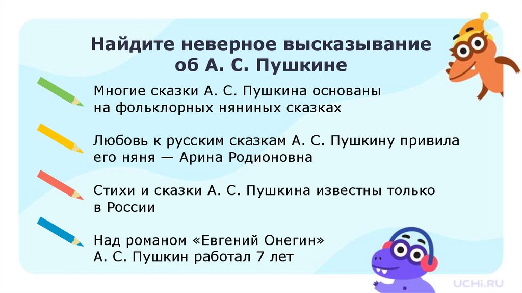 Найдите неверное высказываниеоб А. С. Пушкине