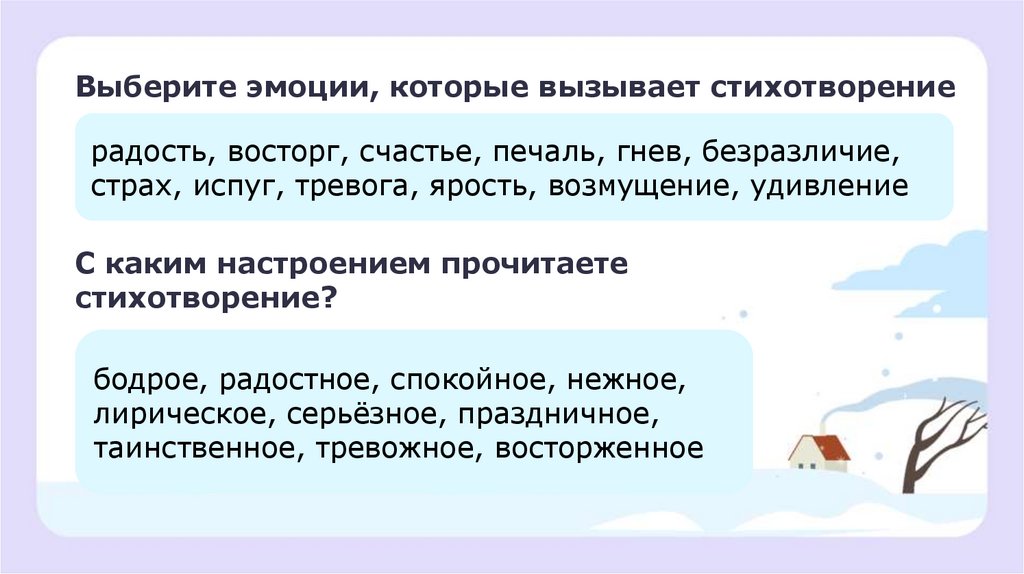 Выберите эмоции, которые вызывает стихотворениерадость, восторг, счастье, печаль, гнев, безразличие,