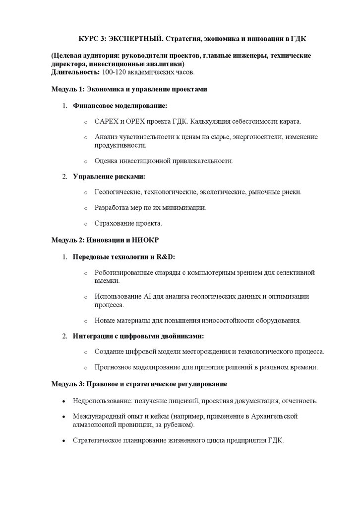 КУРС 3: ЭКСПЕРТНЫЙ. Стратегия, экономика и инновации в ГДК(Целевая аудитория: руководители проектов, главные инженеры, технические