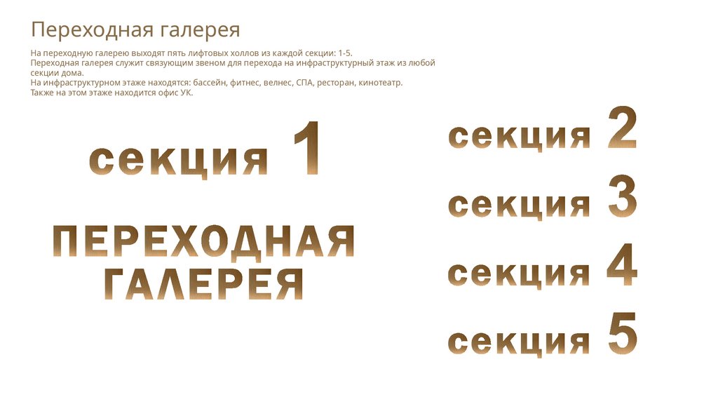 Переходная галереяНа переходную галерею выходят пять лифтовых холлов из каждой секции: 1-5.