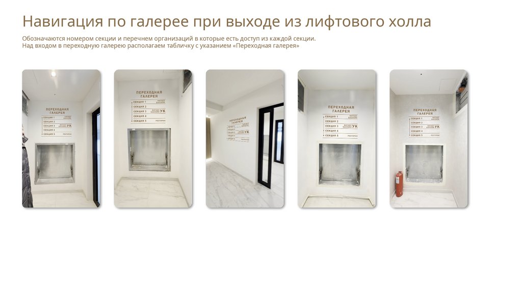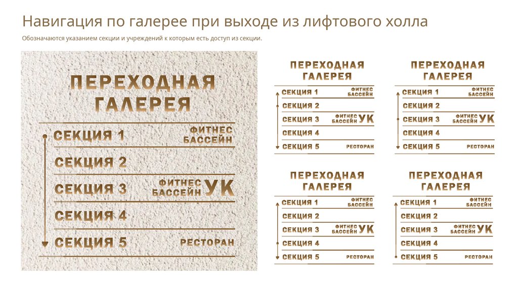Навигация по галерее при выходе из лифтового холлаОбозначаются указанием секции и учреждений к которым есть доступ из секции.
