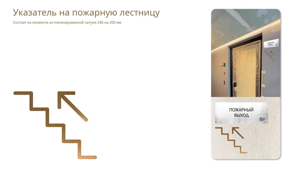 Указатель на пожарную лестницуСостоит из элемента из патинированной латуни 246 на 200 мм