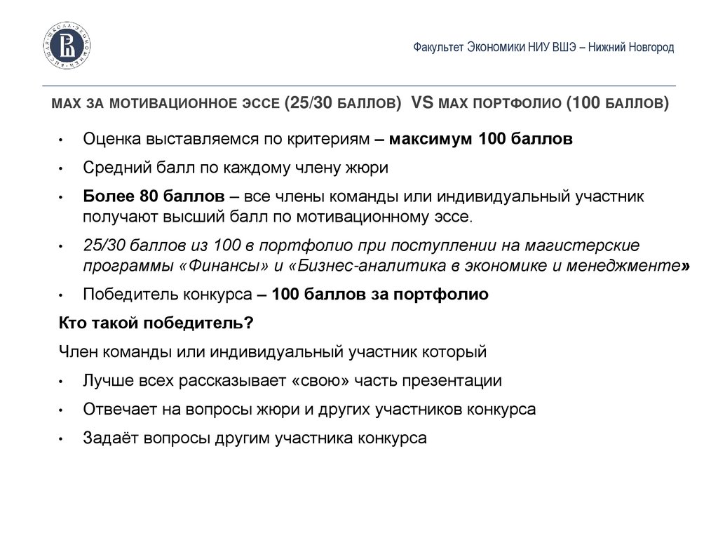 Факультет Экономики НИУ ВШЭ – Нижний НовгородMAX ЗА МОТИВАЦИОННОЕ ЭССЕ (25/30 БАЛЛОВ) VS MAX ПОРТФОЛИО (100 БАЛЛОВ)