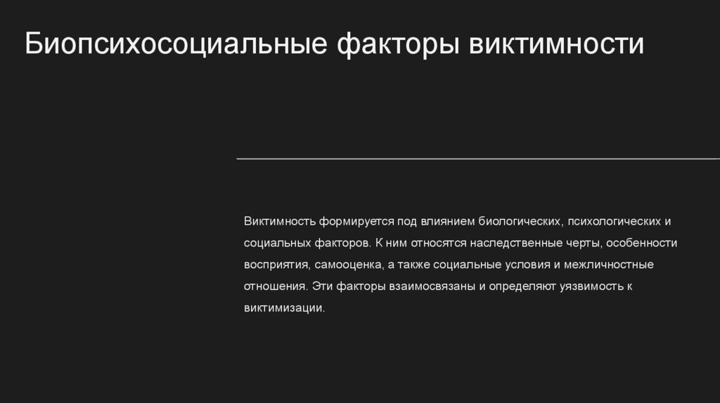 Биопсихосоциальные факторы виктимностиВиктимность формируется под влиянием биологических, психологических и