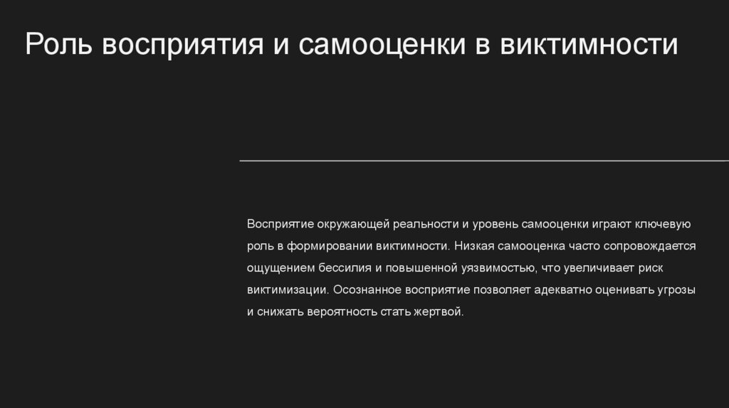 Роль восприятия и самооценки в виктимностиВосприятие окружающей реальности и уровень самооценки играют ключевую