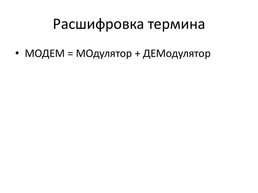 Расшифровка термина• МОДЕМ = МОдулятор + ДЕМодулятор