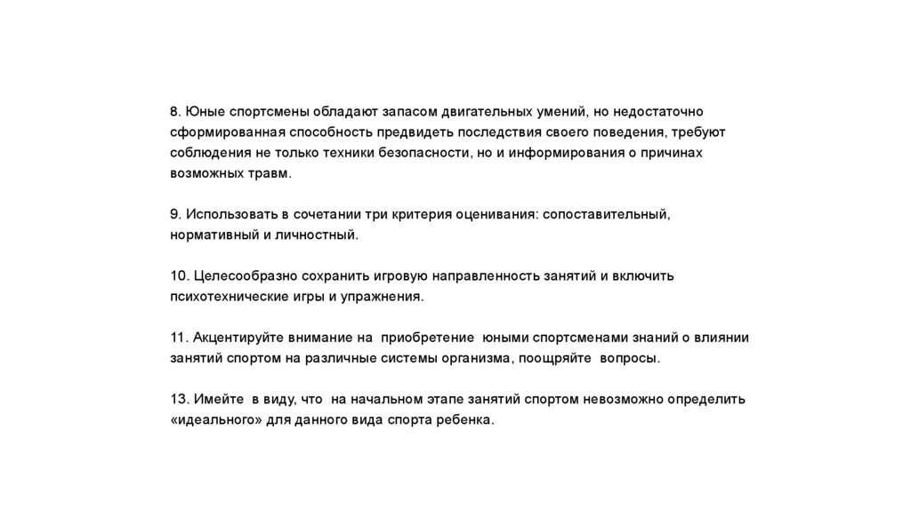 8. Юные спортсмены обладают запасом двигательных умений, но недостаточносформированная способность предвидеть последствия своего поведения, требуют