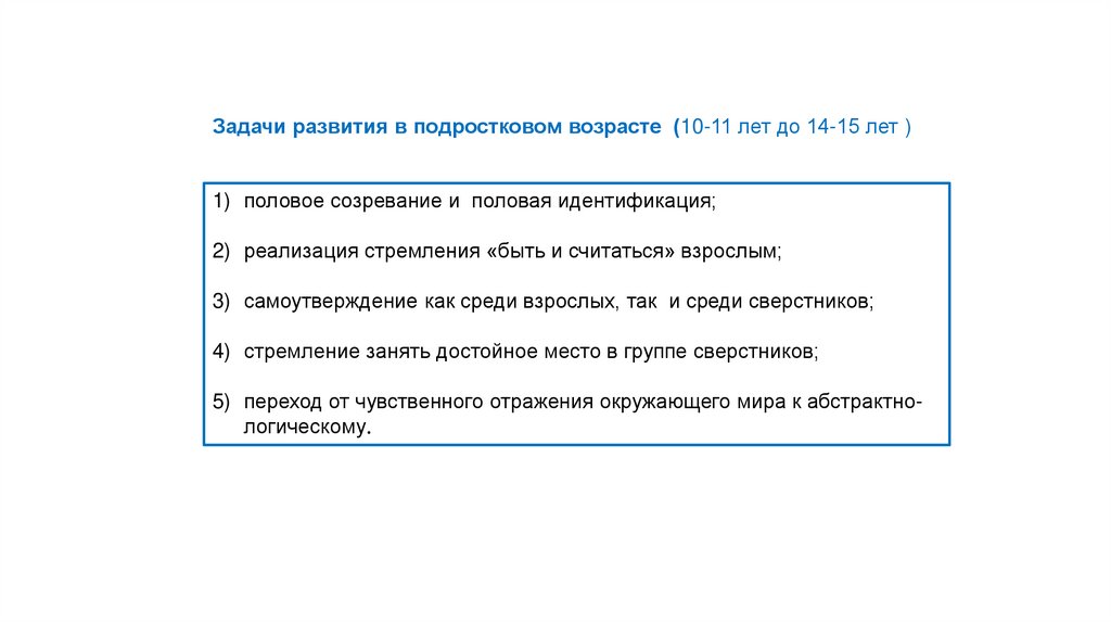 Задачи развития в подростковом возрасте (10-11 лет до 14-15 лет )1) половое созревание и половая идентификация;