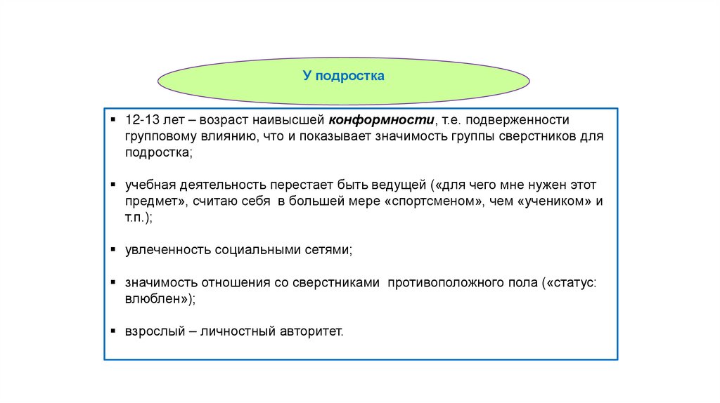 У подростка12-13 лет – возраст наивысшей конформности, т.е. подверженности