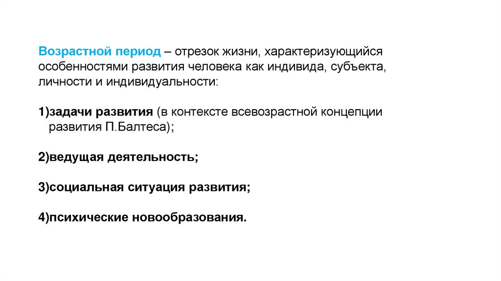 Возрастной период – отрезок жизни, характеризующийсяособенностями развития человека как индивида, субъекта,