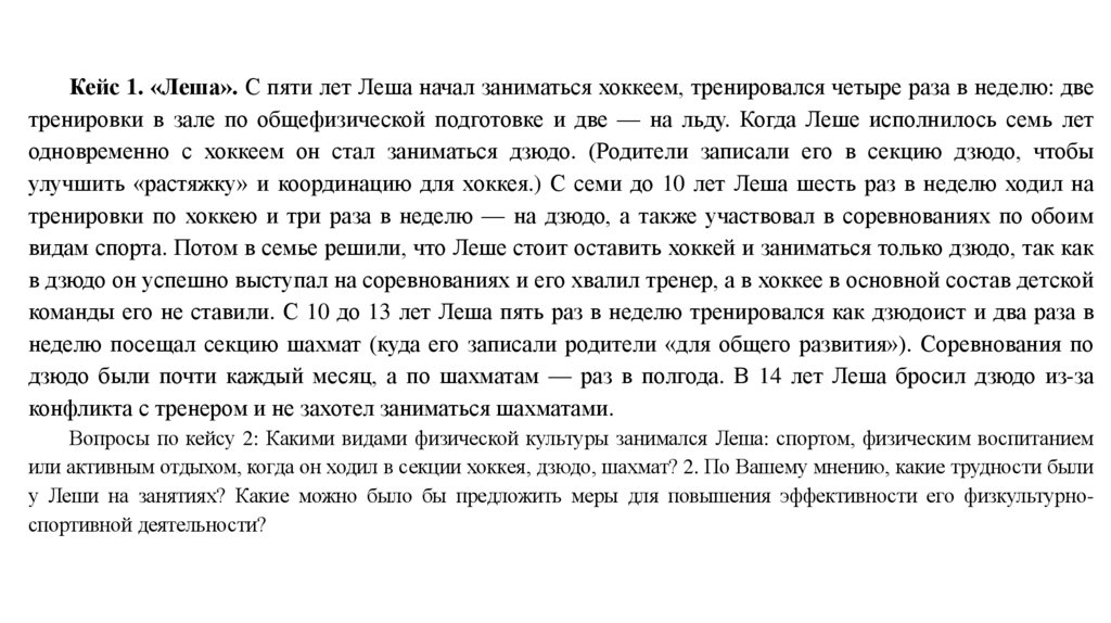Вопросы по кейсу 2: Какими видами физической культуры занимался Леша: спортом, физическим воспитанием