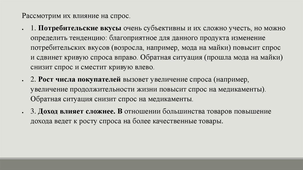 Рассмотрим их влияние на спрос.1. Потребительские вкусы очень субъективны и их сложно учесть, но можно