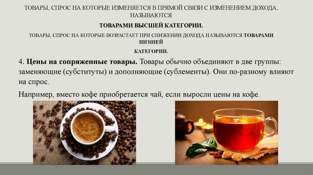 Например, вместо кофе приобретается чай, если выросли цены на кофе.