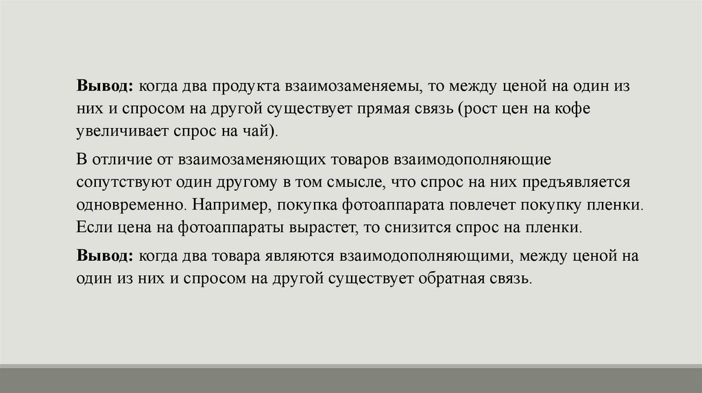 Вывод: когда два продукта взаимозаменяемы, то между ценой на один изних и спросом на другой существует прямая связь (рост цен на кофе