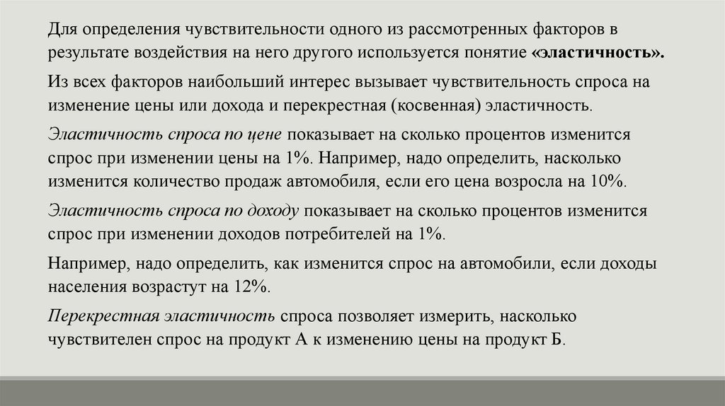 Для определения чувствительности одного из рассмотренных факторов врезультате воздействия на него другого используется понятие «эластичность».
