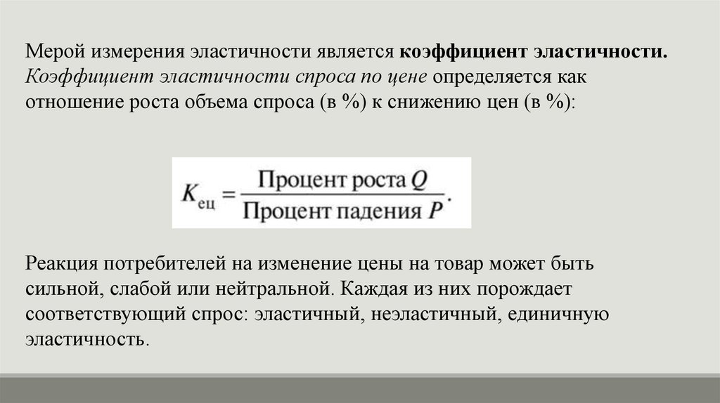 Мерой измерения эластичности является коэффициент эластичности.Коэффициент эластичности спроса по цене определяется как