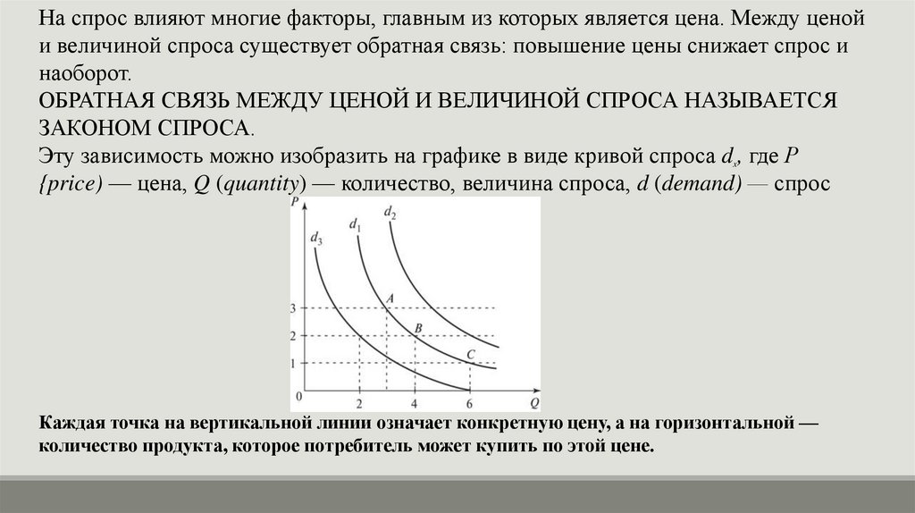 На спрос влияют многие факторы, главным из которых является цена. Между ценойи величиной спроса существует обратная связь: повышение цены снижает спрос и