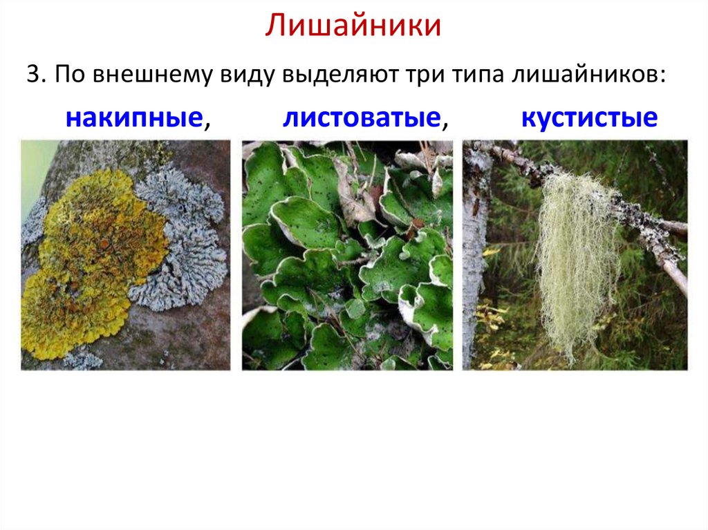 3. Какие три типа лишайников выделяют по внешнему виду?