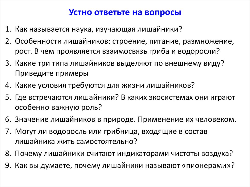 Устно ответьте на вопросы1. Как называется наука, изучающая лишайники?