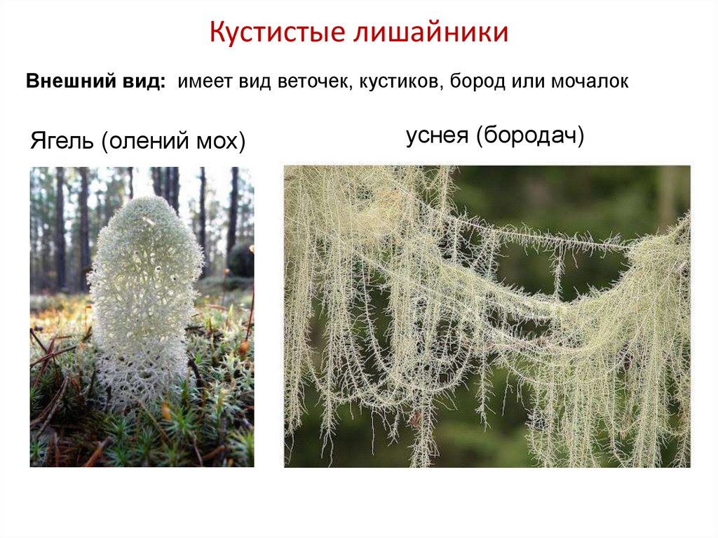 Кустистые лишайникиВнешний вид: имеет вид веточек, кустиков, бород или мочалок