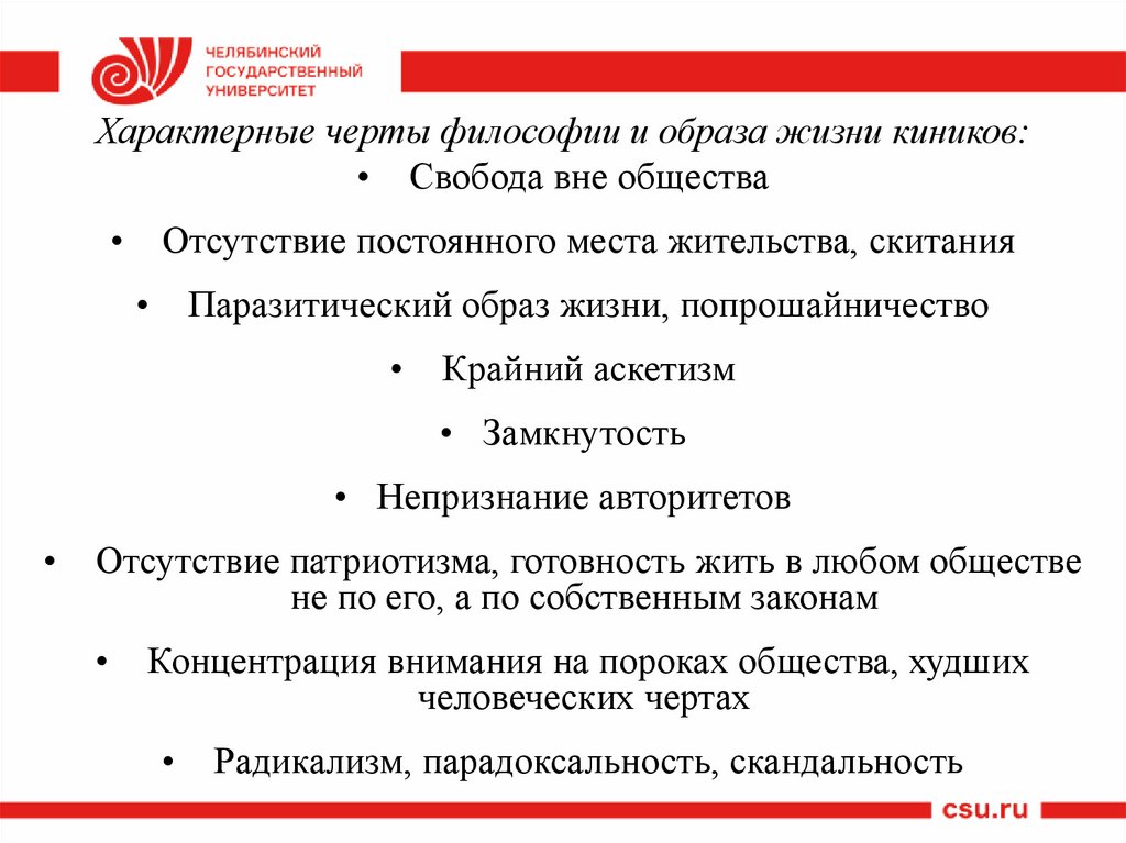 Характерные черты философии и образа жизни киников:• Свобода вне общества