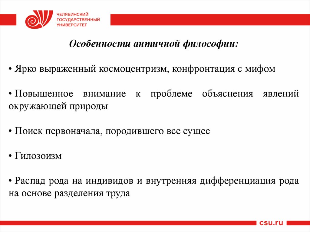 Особенности античной философии:• Ярко выраженный космоцентризм, конфронтация с мифом