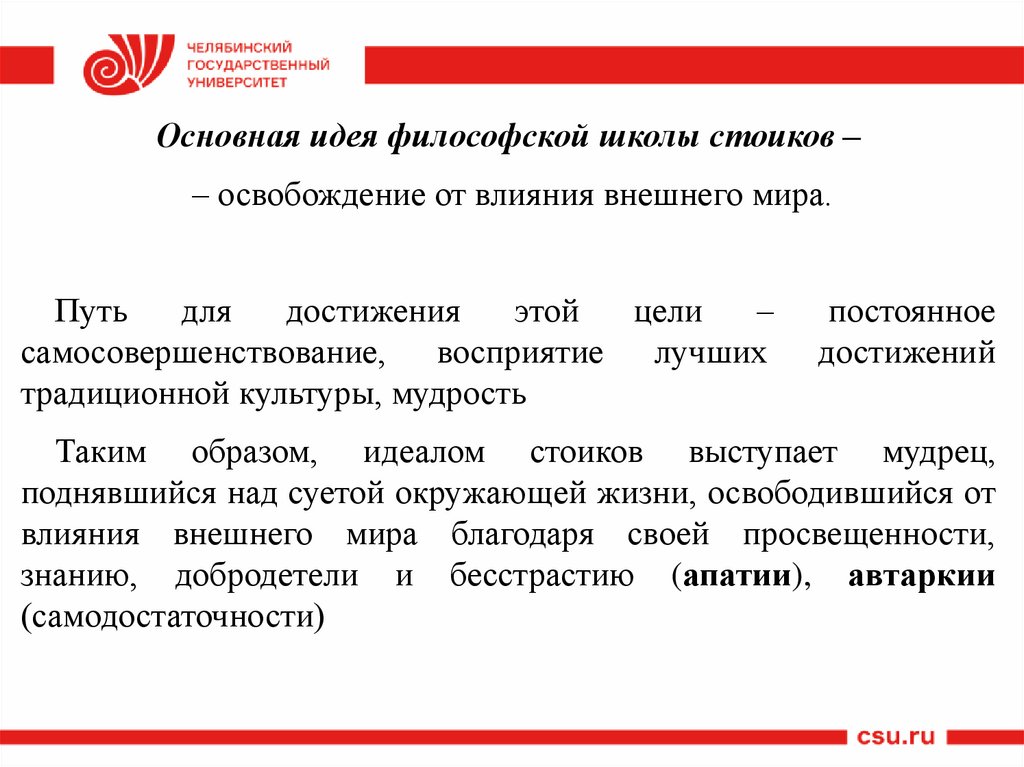 Основная идея философской школы стоиков –– освобождение от влияния внешнего мира.