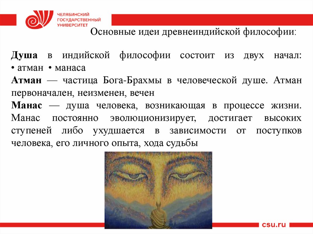 Основные идеи древнеиндийской философии:Душа в индийской философии состоит из двух начал: