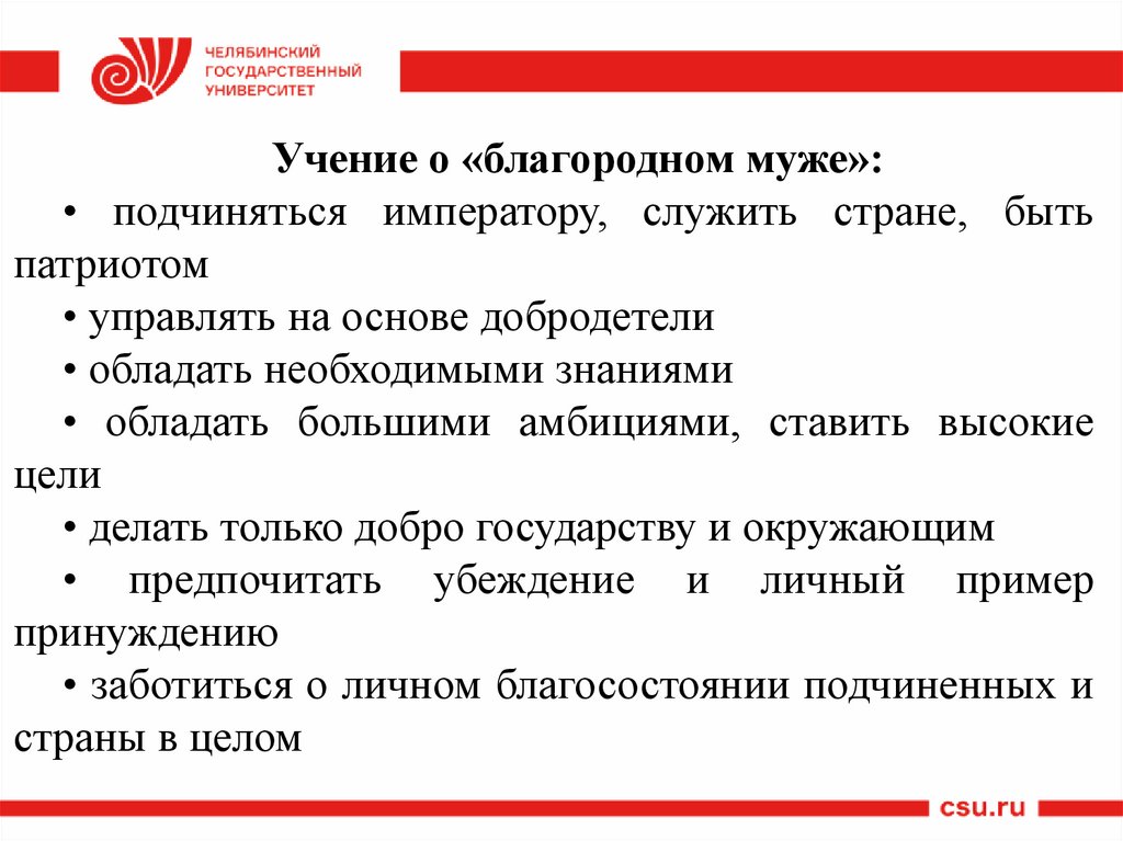 Учение о «благородном муже»:• подчиняться императору, служить стране, быть