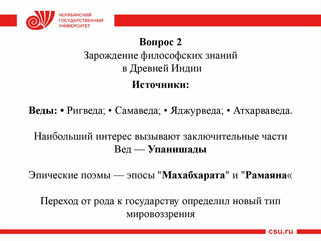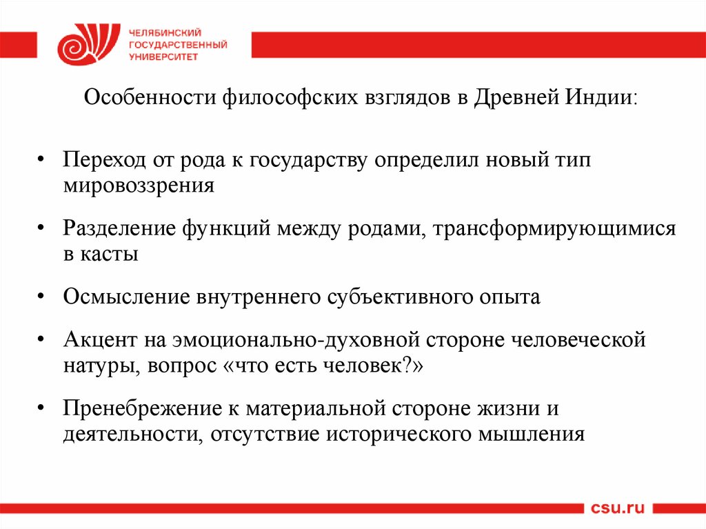 Особенности философских взглядов в Древней Индии:• Переход от рода к государству определил новый тип