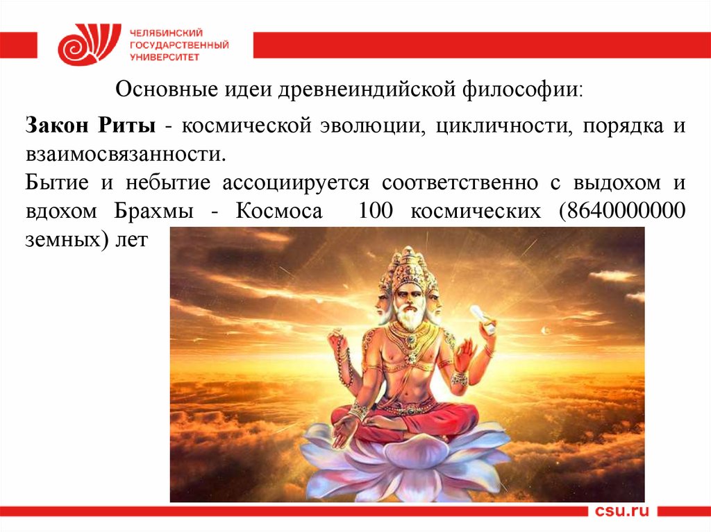 Основные идеи древнеиндийской философии:Закон Риты - космической эволюции, цикличности, порядка и