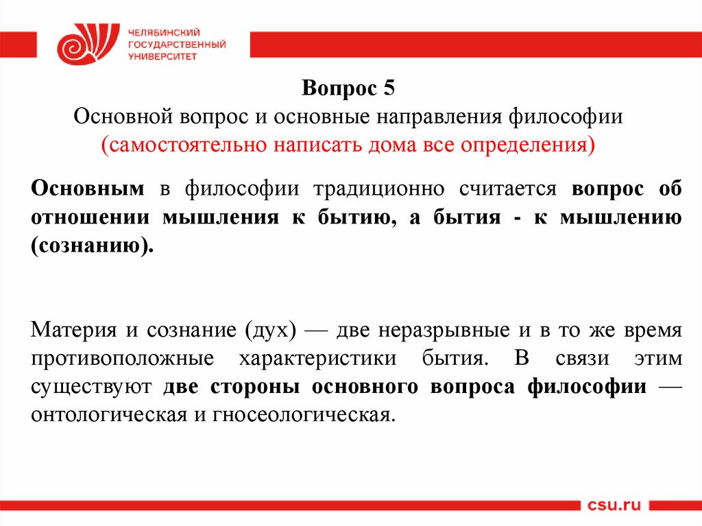 5. Основной вопрос и основные направления философии