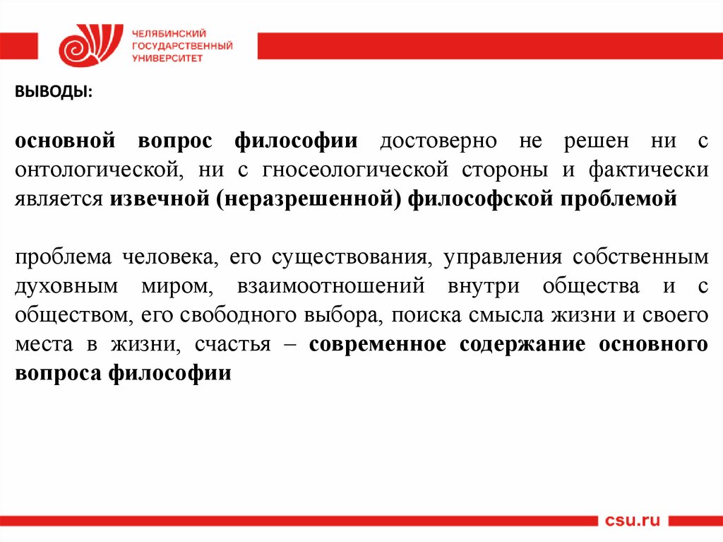 ВЫВОДЫ:основной вопрос философии достоверно не решен ни с