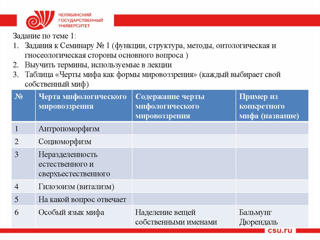 3. Таблица «Черты мифа как формы мировоззрения» (каждый выбирает свой
