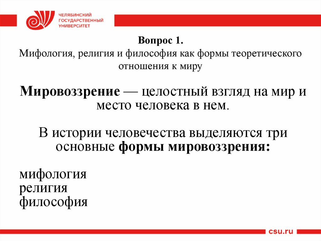 1. Мифология, религия и философия как формытеоретического отношения к миру