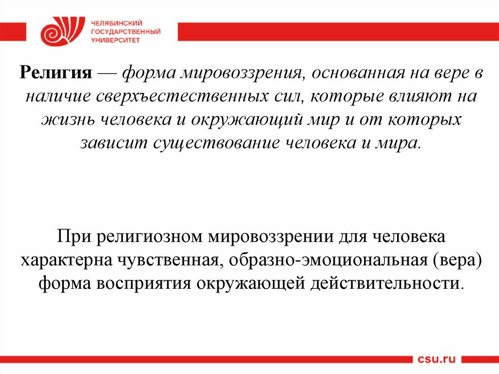 Религия — форма мировоззрения, основанная на вере вналичие сверхъестественных сил, которые влияют на