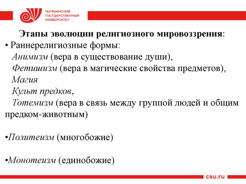 Этапы эволюции религиозного мировоззрения:• Раннерелигиозные формы: