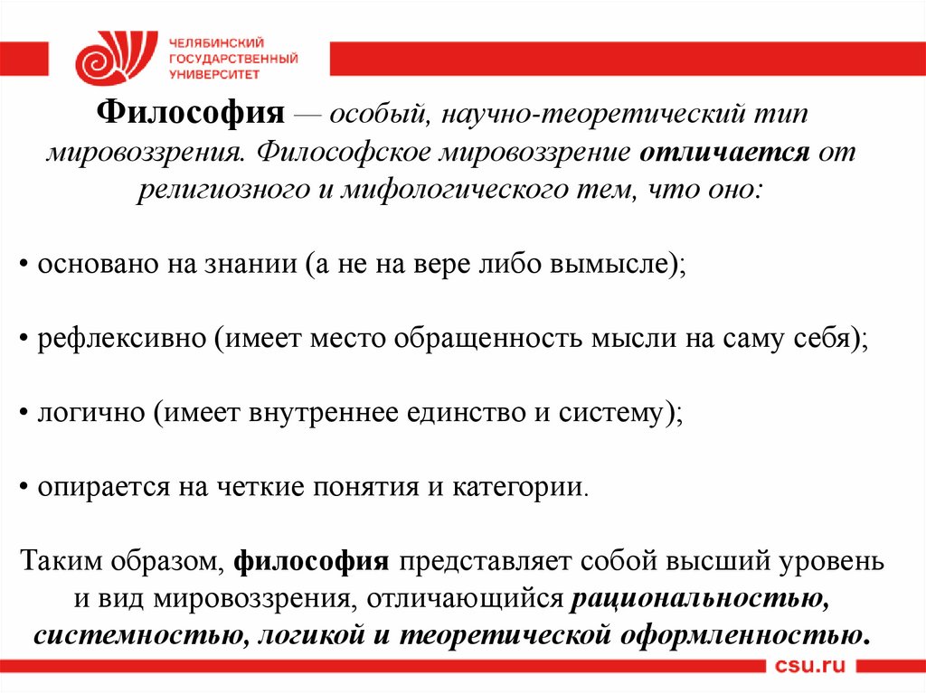 Философия — особый, научно-теоретический типмировоззрения. Философское мировоззрение отличается от