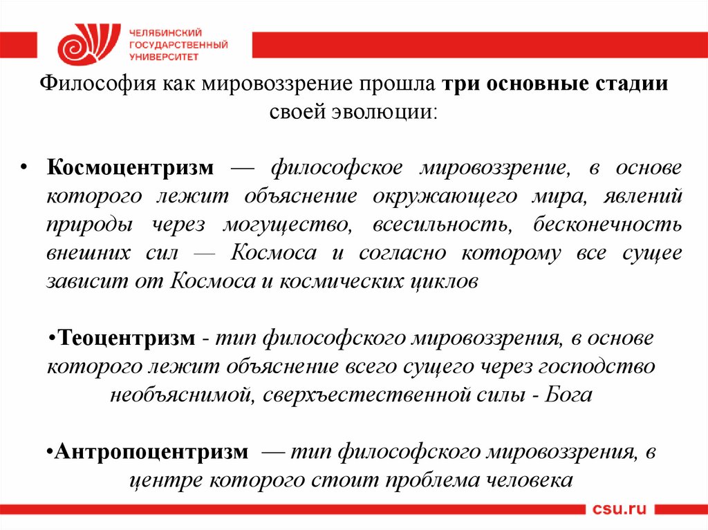 Философия как мировоззрение прошла три основные стадиисвоей эволюции: