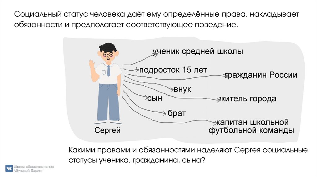 Социальный статус человека даёт ему определённые права, накладываетобязанности и предполагает соответствующее поведение.