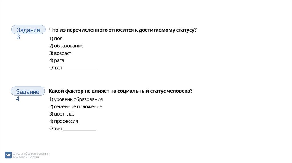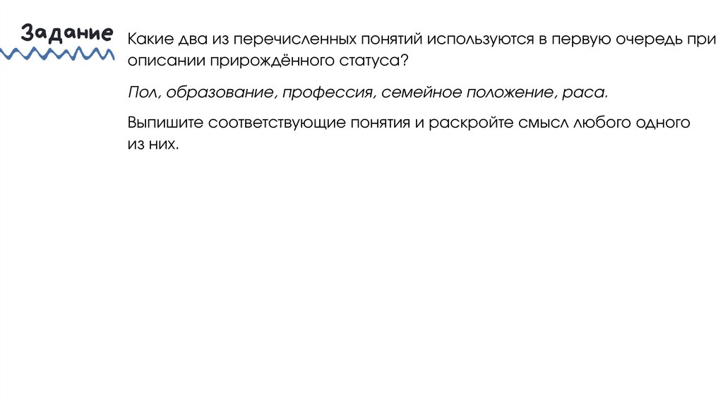 Задание Какие два из перечисленных понятий используются в первую очередь приописании прирождённого статуса?