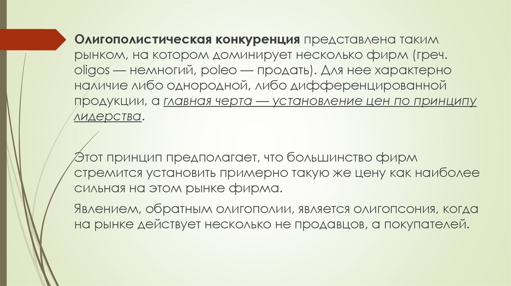 Олигополистическая конкуренция представлена такимрынком, на котором доминирует несколько фирм (греч.